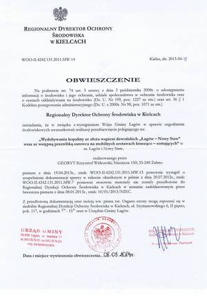 Obwieszczenie RDOŚ w Kielcach w sprawie ponownego wystąpienia o uzupełnienie dokumentacji na potrzeby uzgodnieni warunków realizacji przedsięwzięcia polegającego na eksploatacji złoża wapieni dewońskich ?Łagów - Nowy Staw? w msc. Łagów i Nowy Staw, gm. Łagów wraz ze wstępną przeróbką surowca na mobilnych zestawach krusząco-sortujących