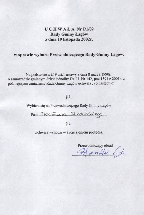 | Uchwała nr I/1/02 Rady Gminy w Łagowie z dn. 19 listopada 2002 r. w sprawie wyboru Przewodniczącego Rady Gminy Łagów. | 2008-10-31 |