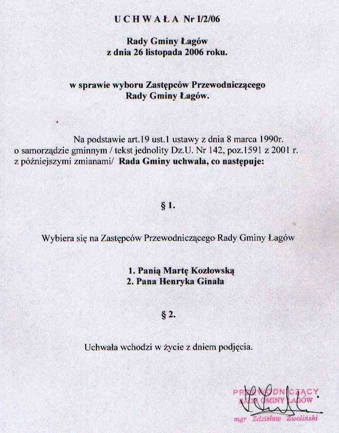| Uchwała nr I/2/06 Rady Gminy w Łagowie z dn. 26 listopada 2006 r. w sprawie wyboru Zastępców Przewodniczącego Rady Gminy Łagów. | 2008-10-07 |