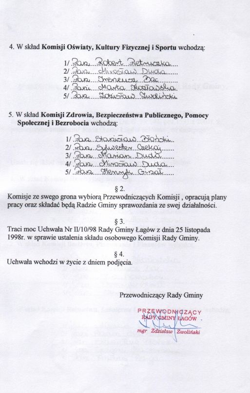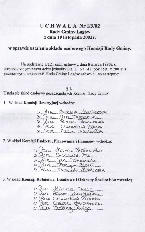 | Uchwała nr I/3/02 Rady Gminy w Łagowie z dn. 19 listopada 2002 r. w sprawie ustalenia składu osobowego Komisji Rady Gminy. | 2008-10-31 |