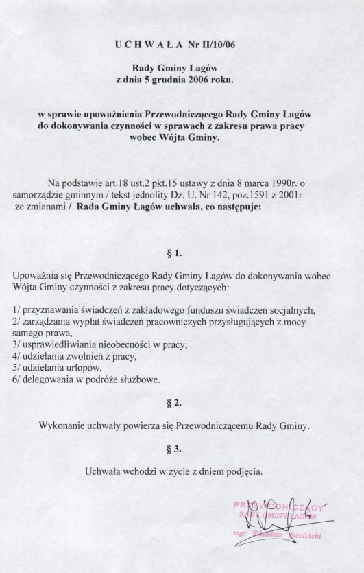 | Uchwała nr II/10/06 Rady Gminy w Łagowie z dn. 5 grudnia 2006 r. w sprawie upoważnienia Przewodniczącego Rady Gminy Łagów do dokonywania czynności w sprawach z zakresu prawa pracy wobec Wójta Gminy. | 2008-10-07 |