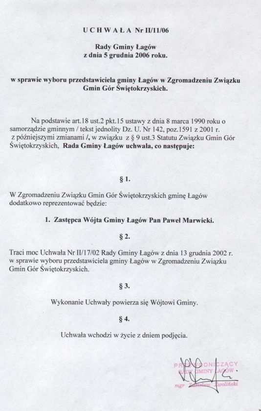 | Uchwała nr II/11/06 Rady Gminy w Łagowie z dn. 5 grudnia 2006 r. w sprawie wyboru przedstawiciela gminy Łagów w Zgromadzeniu Związku Gmin Gór Świętokrzyskich. | 2008-10-07 |