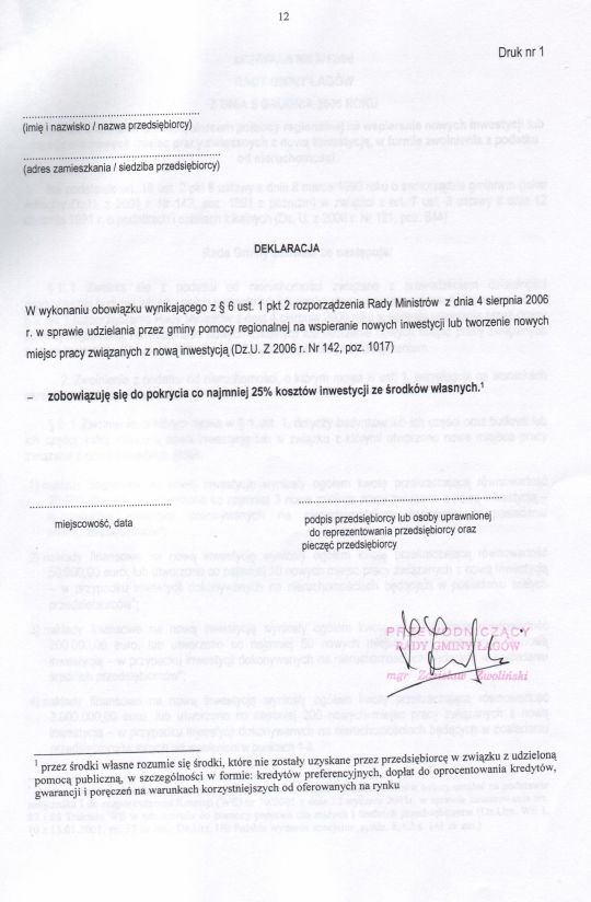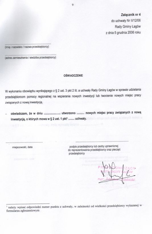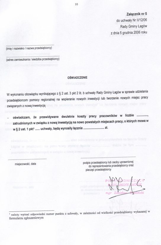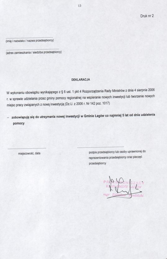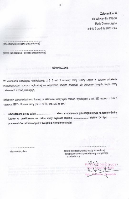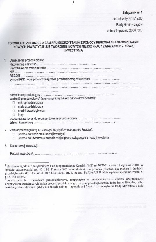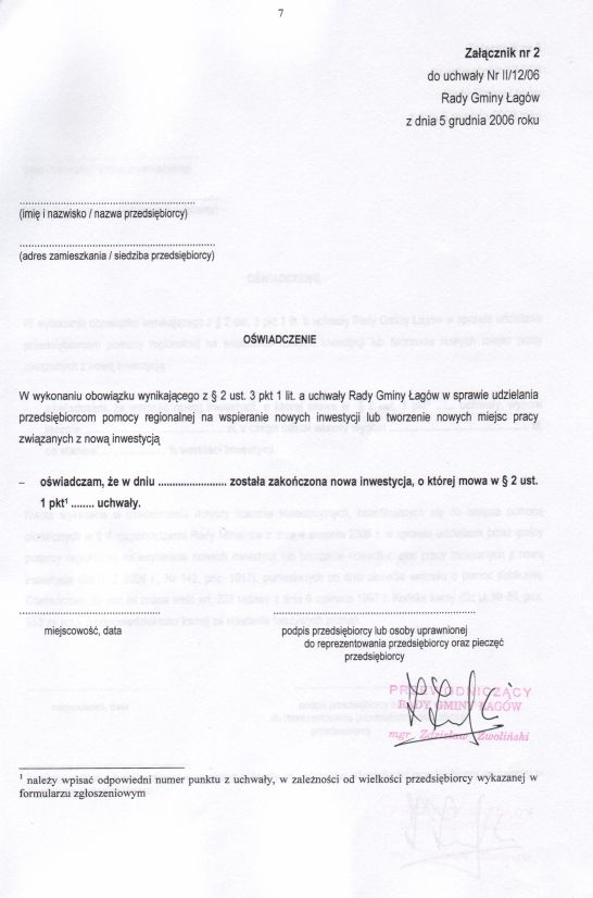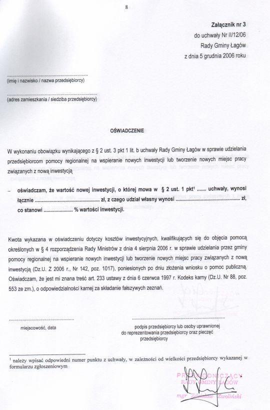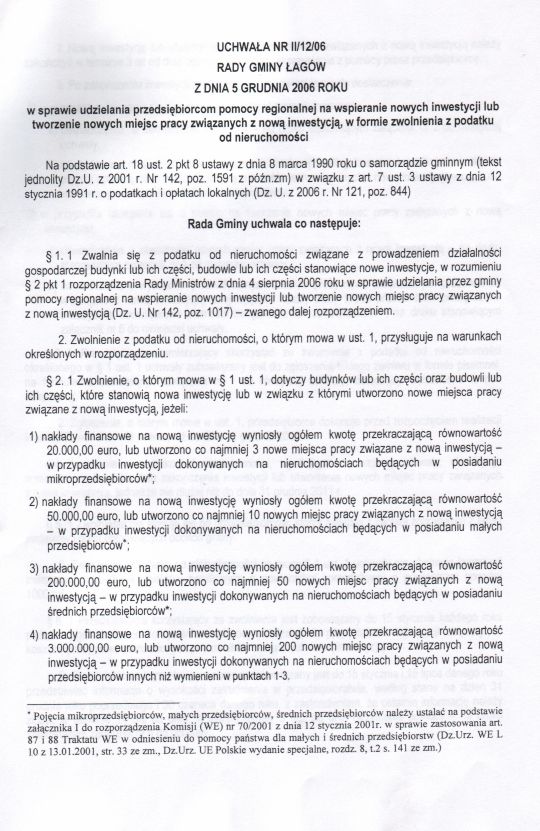 | Uchwała nr II/12/06 rady Gminy w Łagowie z dn. 5 grudnia 2006 r. w sprawie udzielania przedsiębiorcom pomocy regionalnej na wspieranie nowych inwestycji lub tworzenie nowych miejsc pracy związanych z nową inwestycją | 2008-10-07 |