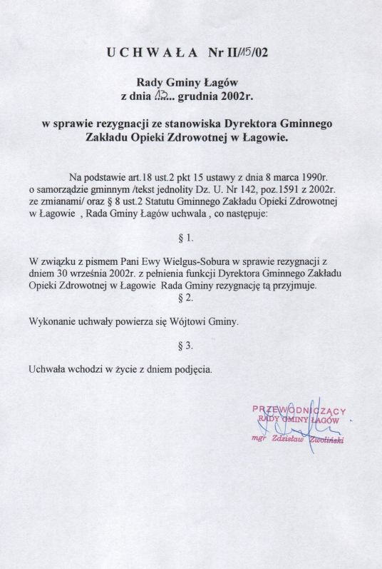 | Uchwała nr II/15/02 Rady Gminy w Łagowie z dn. 13 grudnia 2002 r. w sprawie rezygnacji ze stanowiska Dyrektora Gminnego Zakładu Opieki Zdrowotnej w Łagowie. | 2008-10-31 |