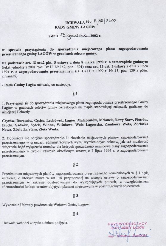 | Uchwała nr II/16/02 Rady Gminy w Łagowie z dn. 13 grudnia 2002 r. w sprawie przystąpienia do sporzadzenia miejscowego planu zagospodarowania przestrzennego gminy ŁAGĂW w granicach sołectw gminy. | 2008-10-31 |