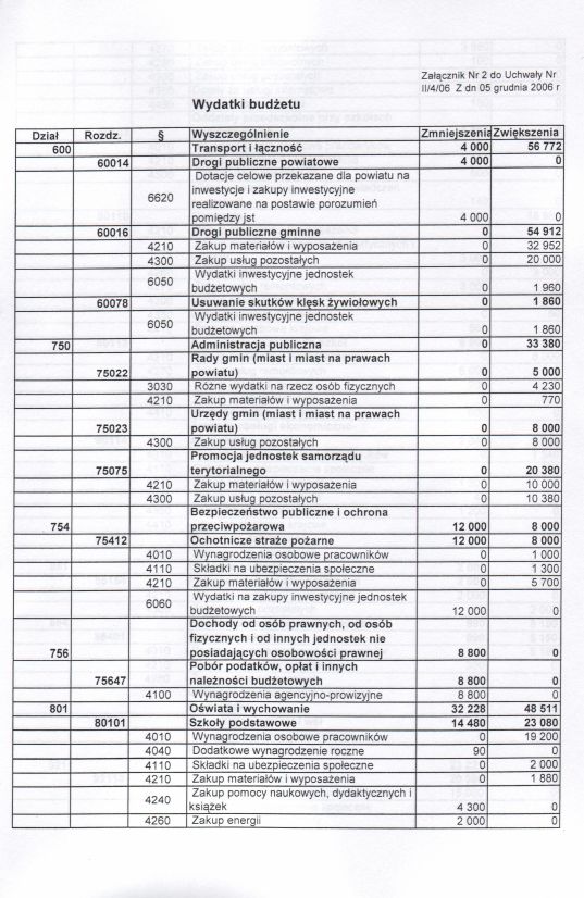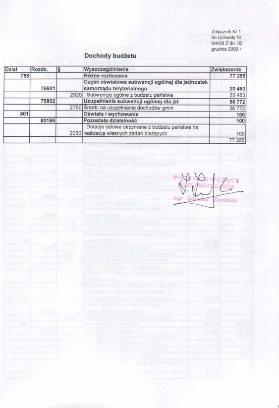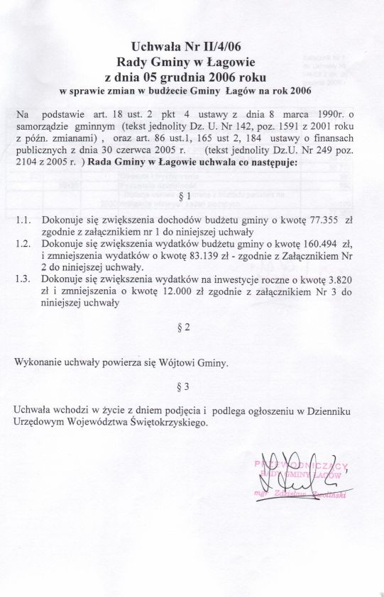 | Uchwała nr II/4/06 Rady Gminy w Łagowie z dn. 5 grudnia 2006 r. w sprawie zmian w budżecie Gminy Łagów na rok 2006. | 2008-10-07 |
