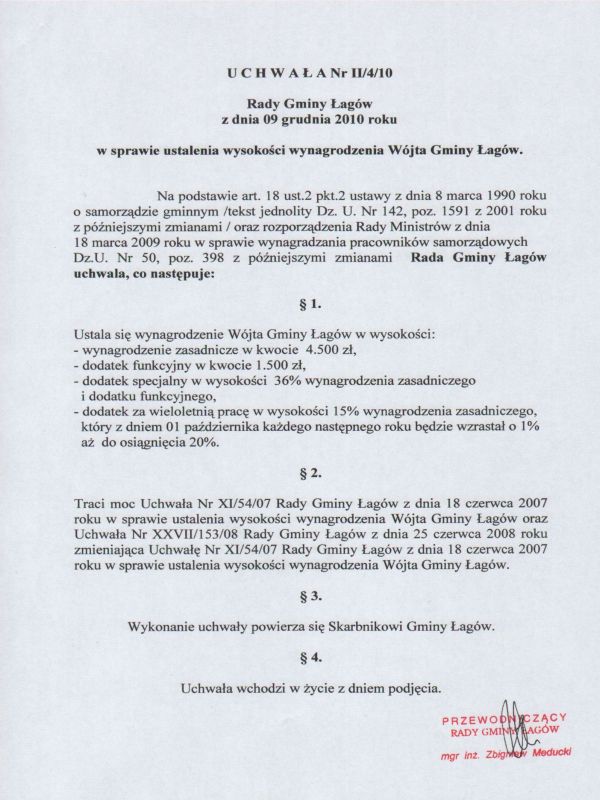 | Uchwała Nr II/4/10 Rady Gminy Łagów z dnia 09 grudnia 2010 roku w sprawie ustalenia wysokości wynagrodzenia Wójta Gminy Łagów | 2012-04-05 |