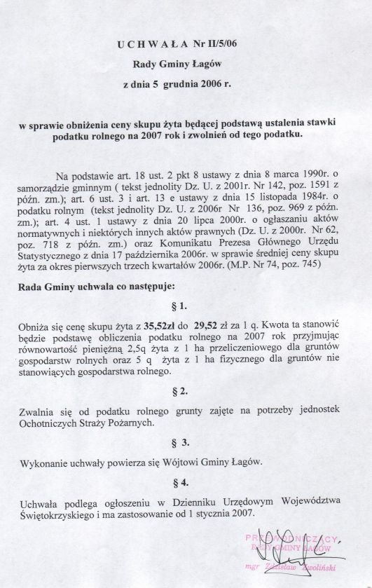 | Uchwała nr II/5/06 Rady Gminy w Łagowie z dn. 5 grudnia 2006 r. w sprawie obniżenia ceny skupu żyta będącej podstawą ustalenia stawki podatku rolnego na 2007 rok i zwolnieĂą od tego podatku. | 2008-10-07 |