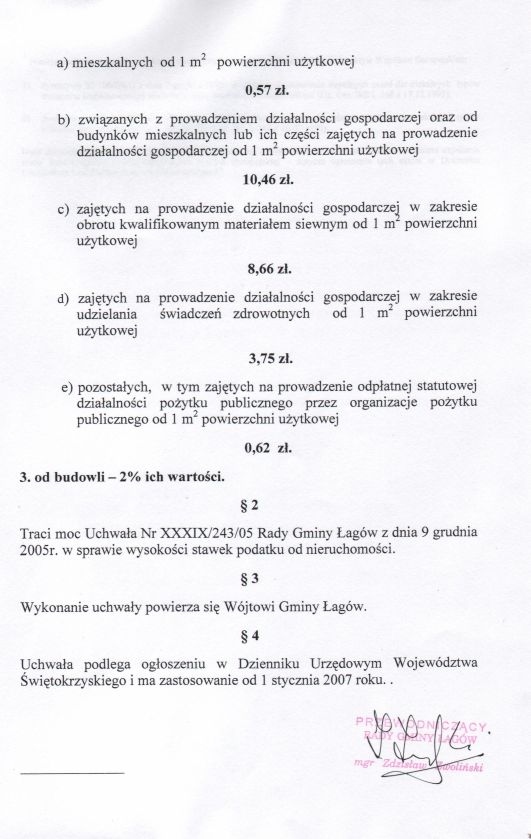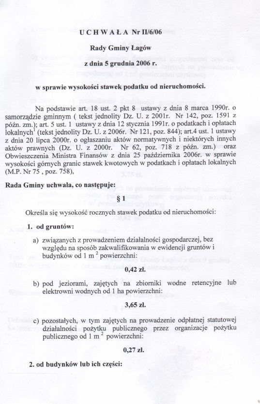 | Uchwała nr II/6/06 Rady Gminy w Łagowie z dn. 5 grudnia 2006 r. w sprawie wysokości stawek podatku od nieruchomości. | 2008-10-07 |