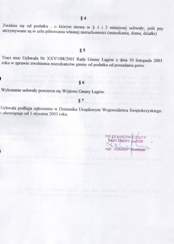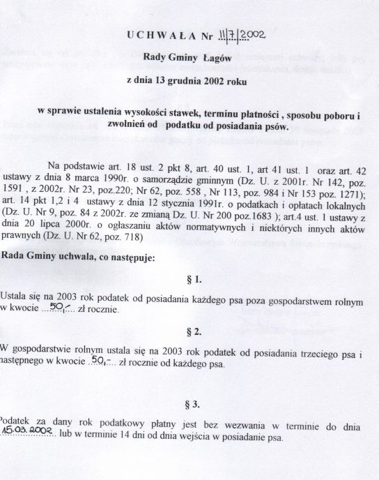 | Uchwała nr II/7/02 Rady Gminy w Łagowie z dn. 13 grudnia 2002 r. w sprawie ustalenia wysokości stawek, terminu płatności, sposobu poboru i zwolnieĂą od podatku od posiadania psów. | 2008-10-31 |