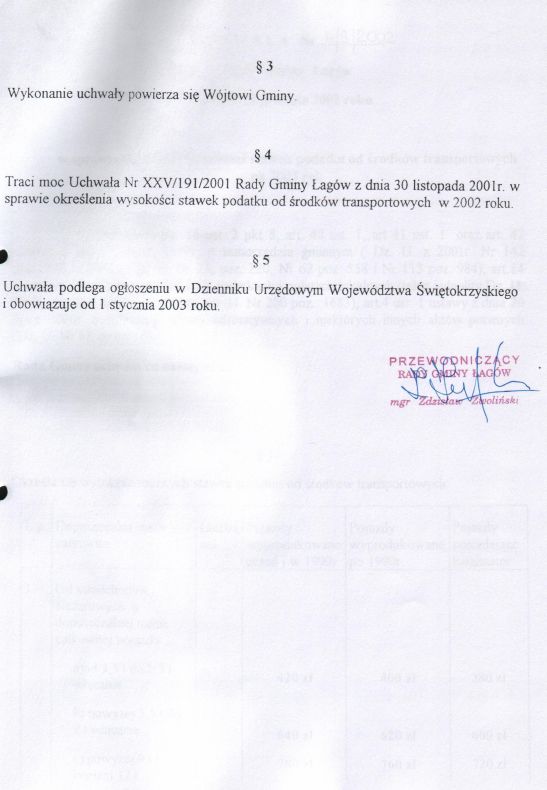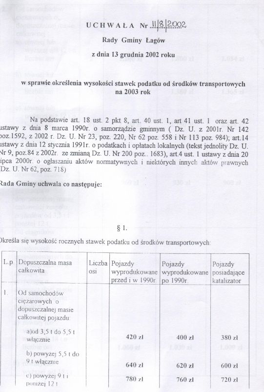 | Uchwała nr II/8/02 Rady Gminy w Łagowie z dn. 13 grudnia 2002 r. w sprawie określenia wysokości stawek podatku od środków transportowych na 2003 rok. | 2008-10-31 |