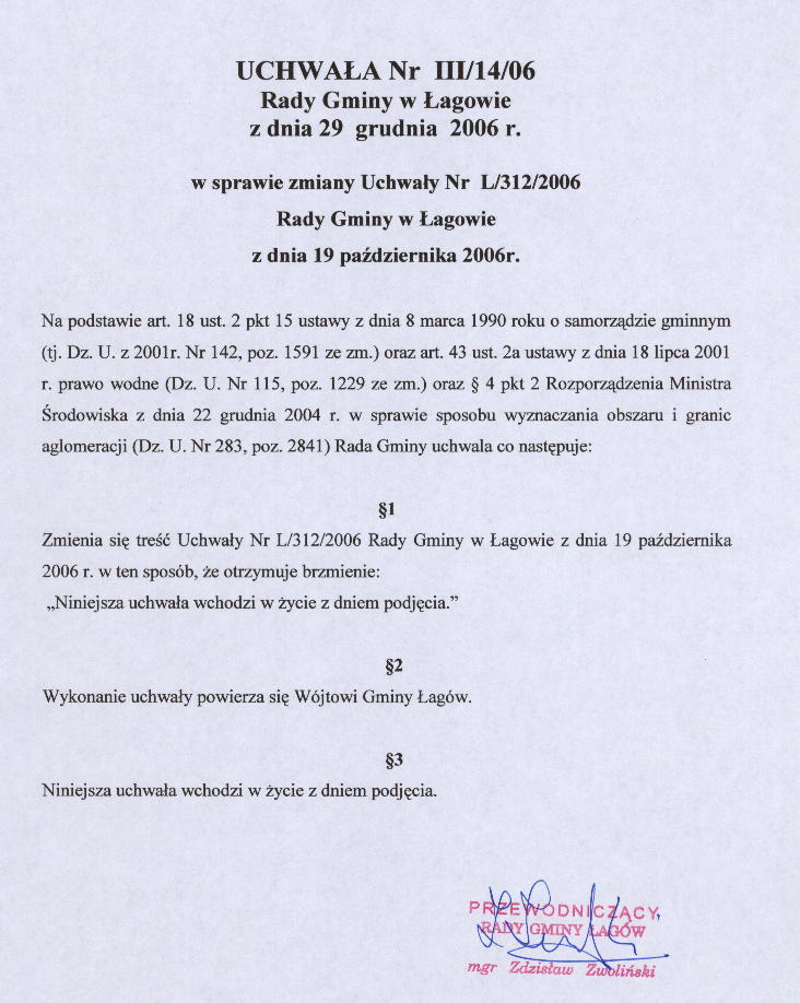 | Uchwała nr III/14/06 Rady Gminy w Łagowie z dn. 29 grudnia 2006 r. w sprawie zmiany uchwały Nr L/312/2006 Rady Gminy w Łagowie z dnia 19 października 2006r. | 2008-10-07 |