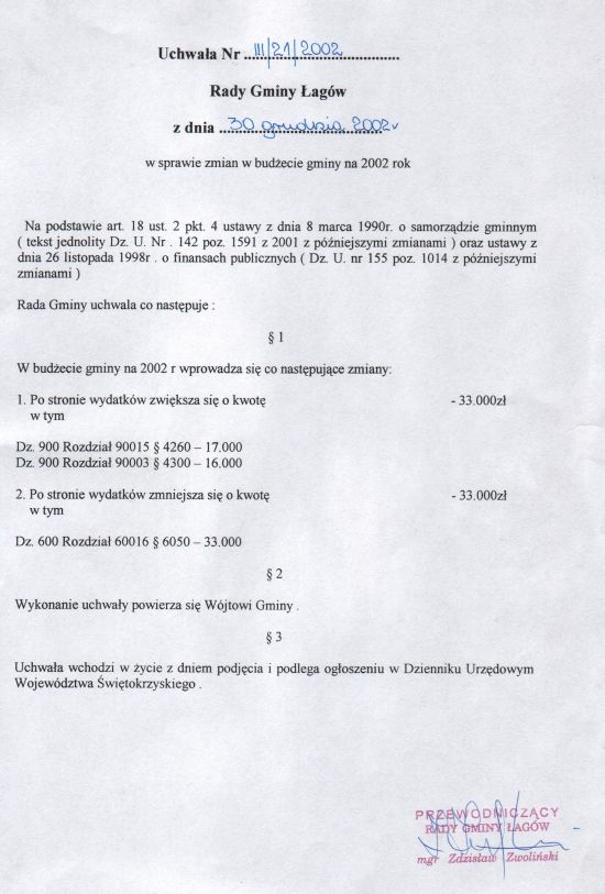| Uchwała nr III/21/02 Rady Gminy w Łagowie z dn. 30 grudnia 2002 r. w sprawie zmian w budżecie gminy na 2002 rok. | 2008-10-31 |