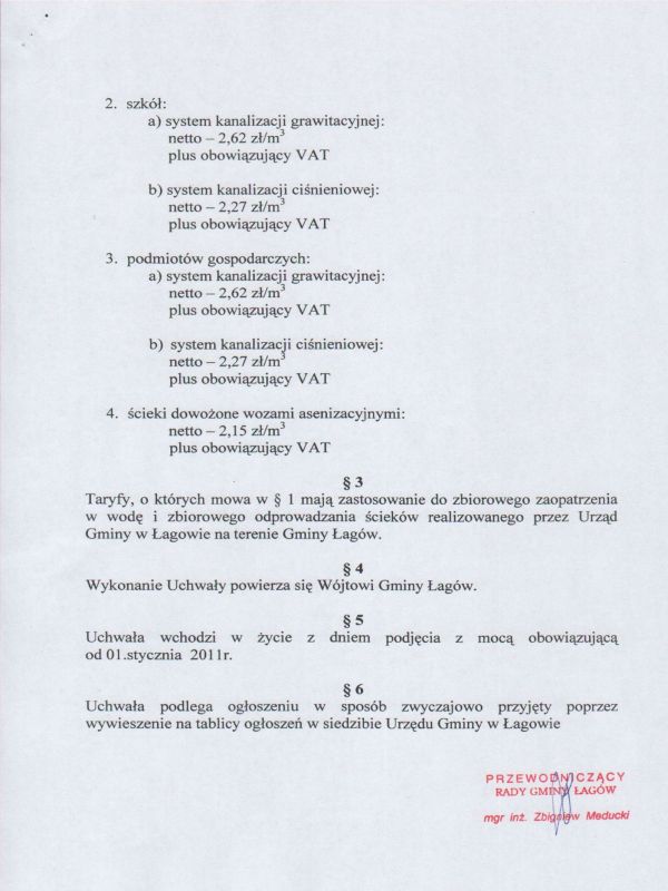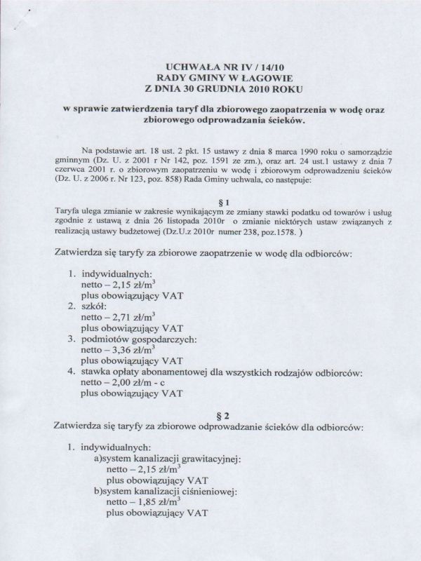 | Uchwała Nr IV/14/10 Rady Gminy Łagów z d. 30 grudnia 2010 r. w sprawie zatwierdzenia taryf dla zbiorowego zaopatzrenia w wodę oraz zbiorowego odprowadzenia ścieków | 2012-04-05 |