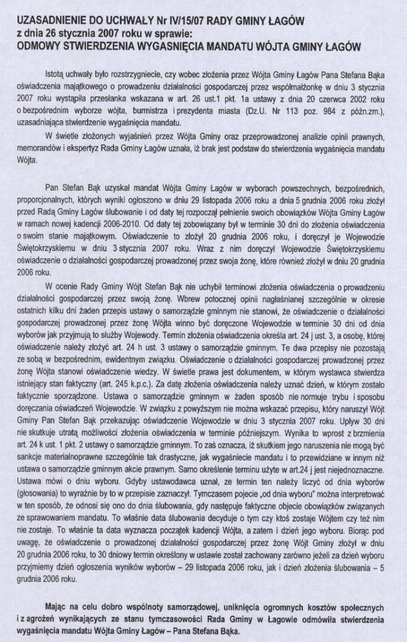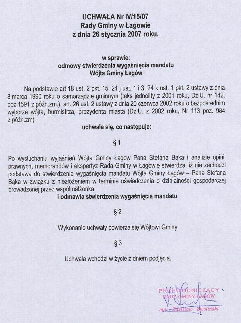 | Uchwała nr IV/15/07 Rady Gminy Łagów z dnia 26 stycznia 2007 r. w sprawie odmowy stwierdzenia wygaśnięcia mandatu Wójta gminy Łagów | 2008-08-14 |