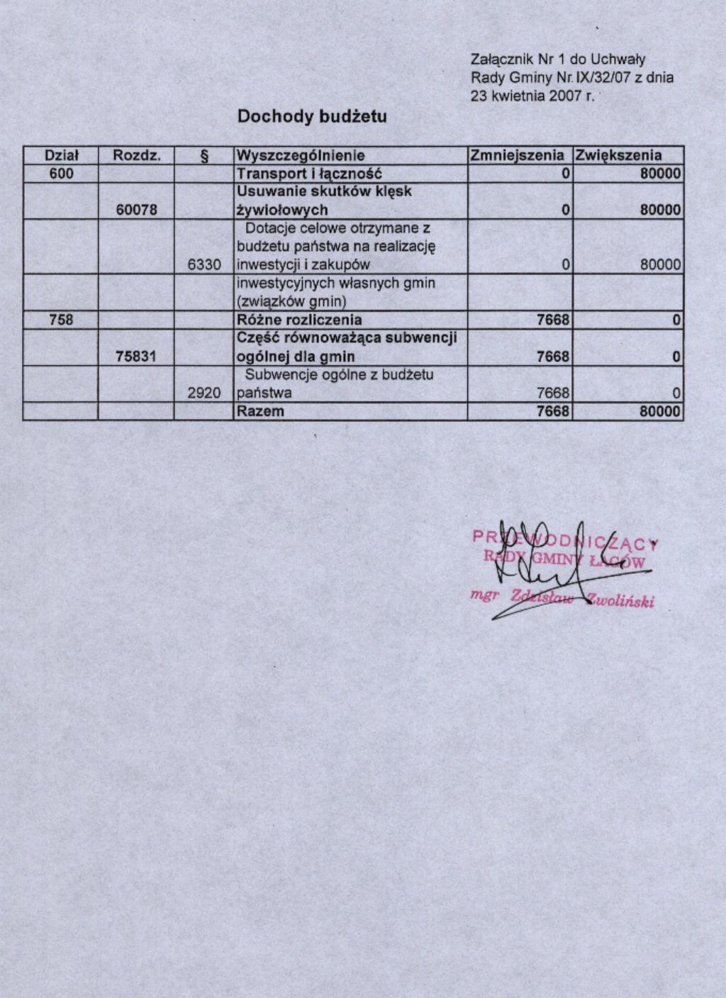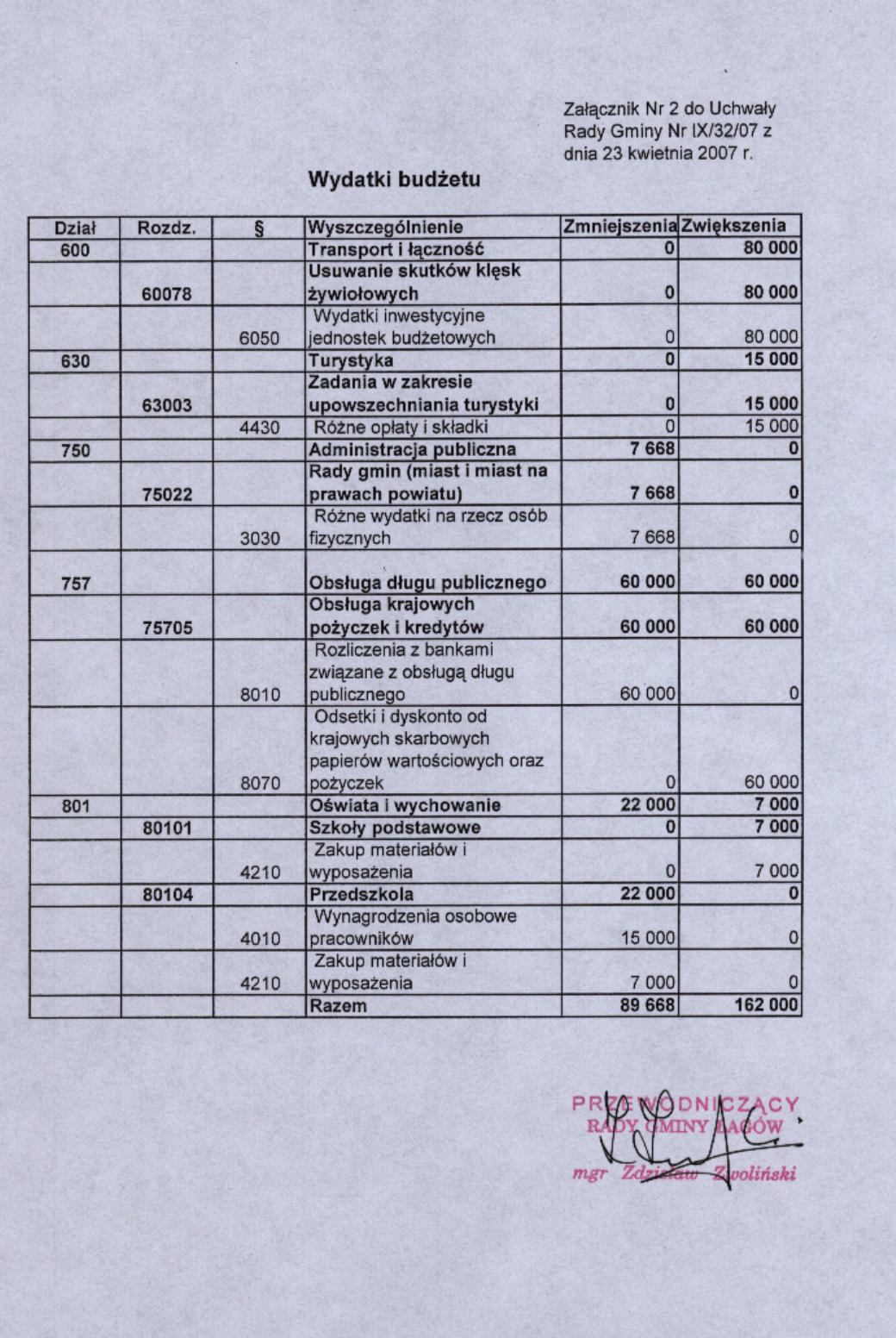 | Uchwała nr IX/32/07 Rady Gminy Łagów z dnia 23 kwietnia 2007 r. w sprawie zmian w budzecie Gminy Łagów na rok 2007 | 2008-08-26 |