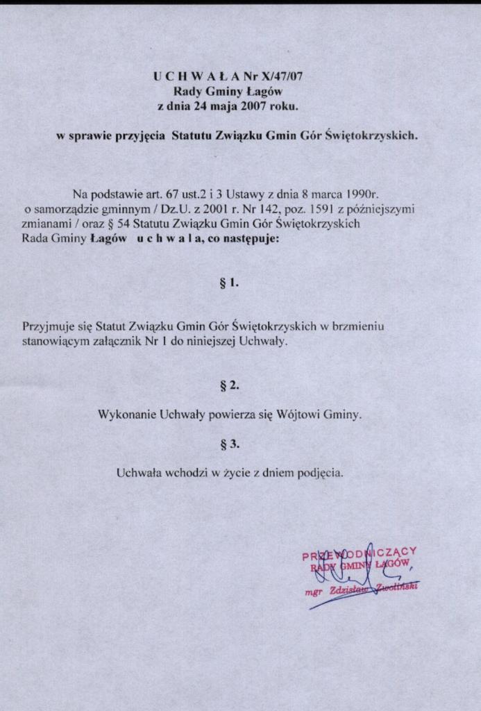 | Uchwała nr IX/47/07 Rady Gminy Łagów z dnia 24 maja 2007 r. w sprawie przyjęcia statutu Związku Gmin Gór świętokrzyskich | 2008-08-26 |