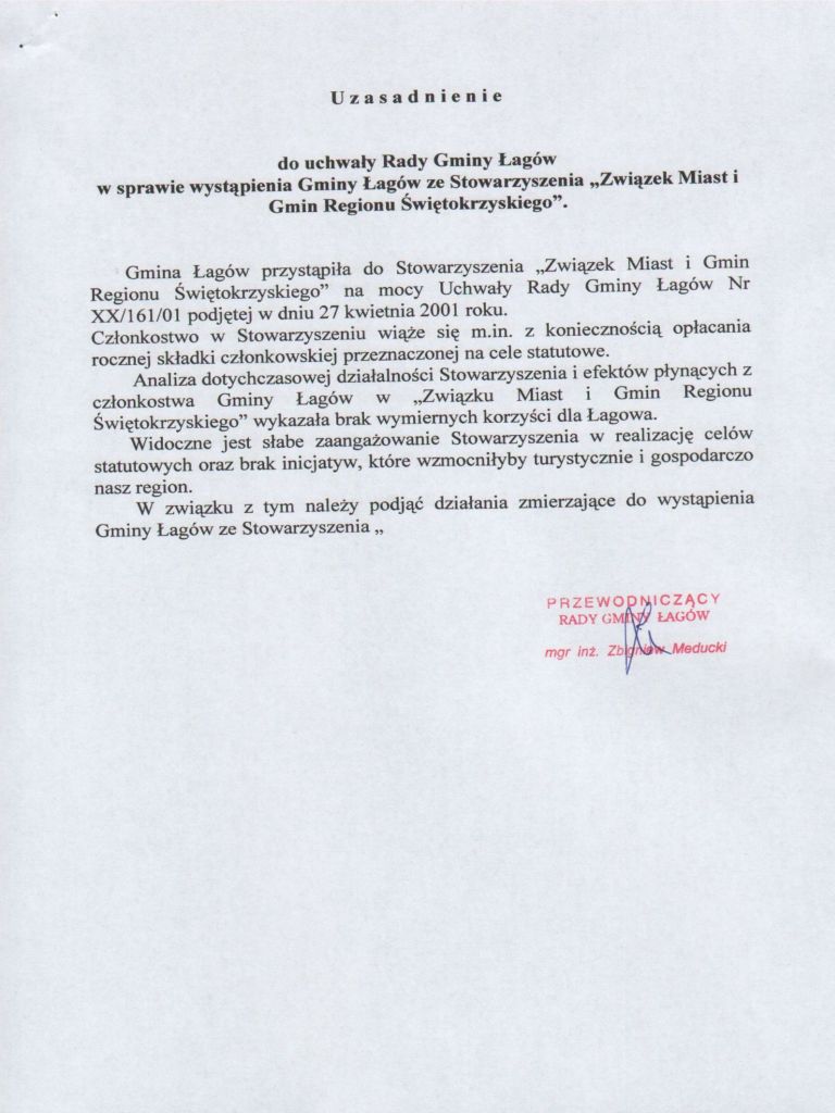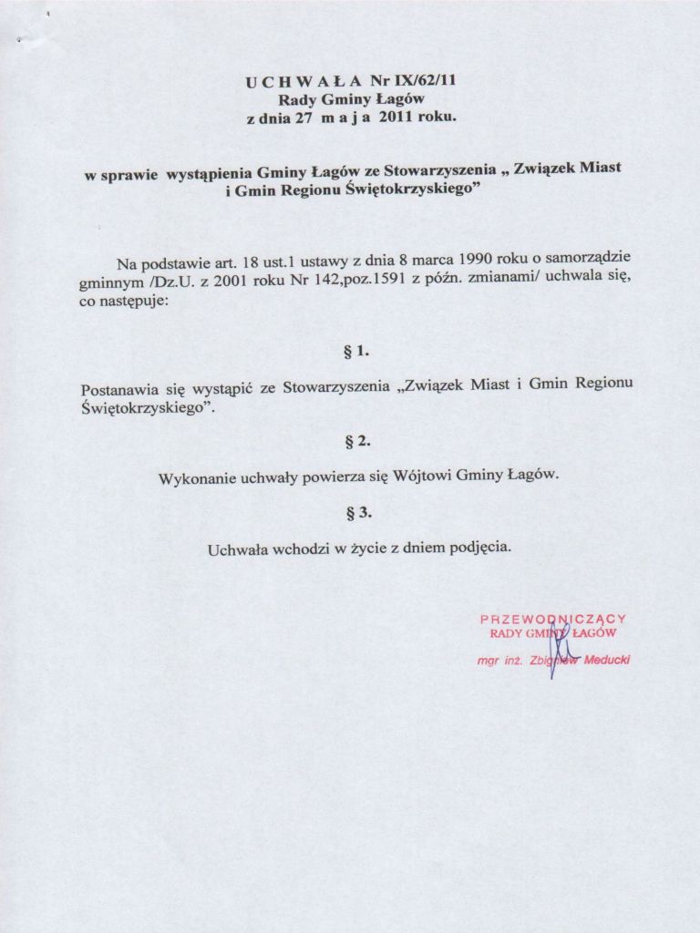 | Uchwała Nr IX/62/11 Rady Gminy Łagów z dnia 27 maja 2011 roku w sprawie wystąpienia Gminy Łagów ze Stowarzyszenia "Związek Miast i Gmin Regionu Świętokrzyskiego" | 2011-06-15 |