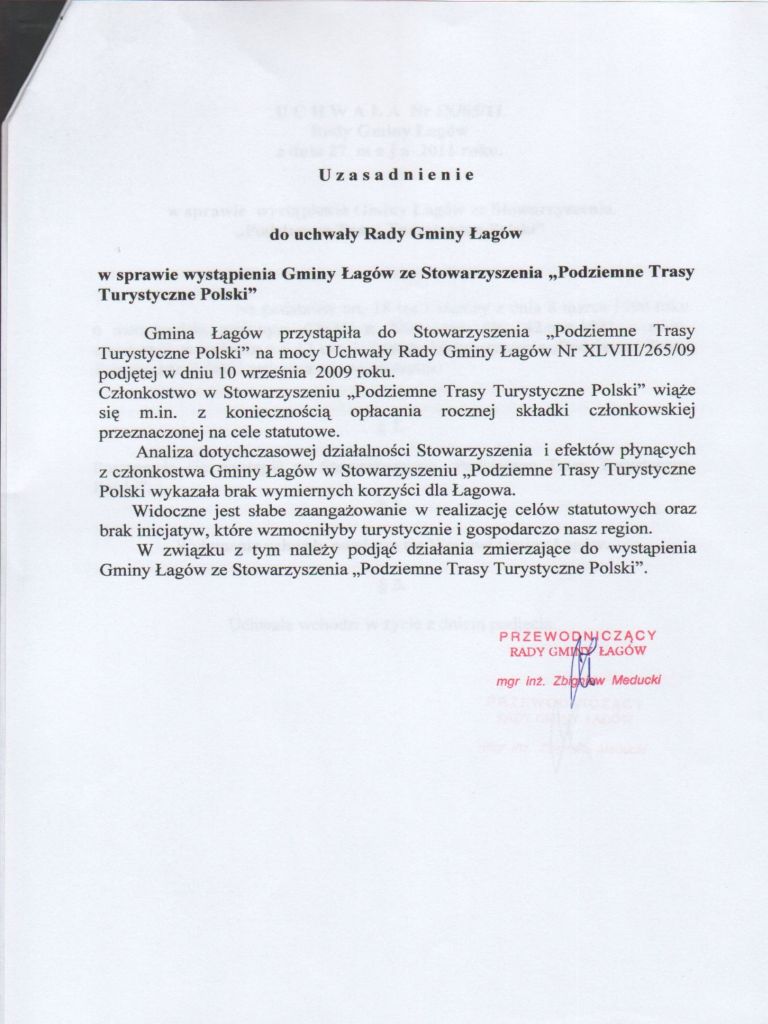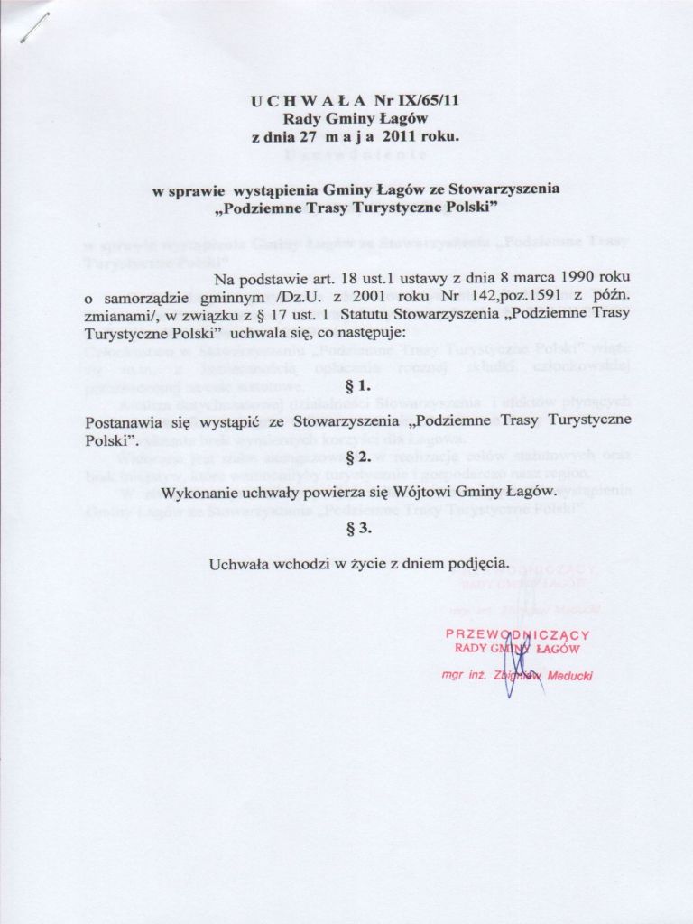 | Uchwała Nr IX/65/11 Rady Gminy Łagów z dnia 27 maja 2011 roku w sprawie wystąpienia Gminy Łagów ze Stowarzyszenia "Podziemne Trasy Turystyczne Polski" | 2011-06-15 |
