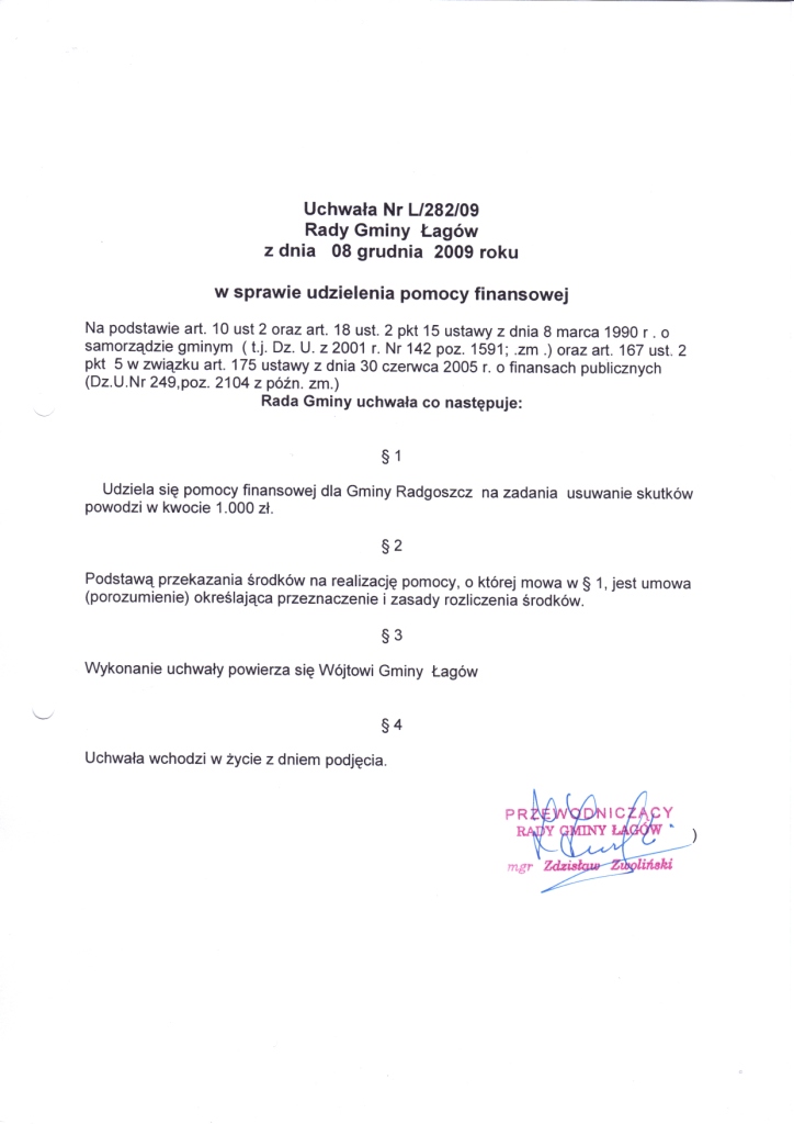 | Uchwała Nr L/282/09 Rady Gminy Łagów z dnia 08 grudnia 2009r. w sprawie udzielenia pomocy finansowej. | 2009-12-22 |