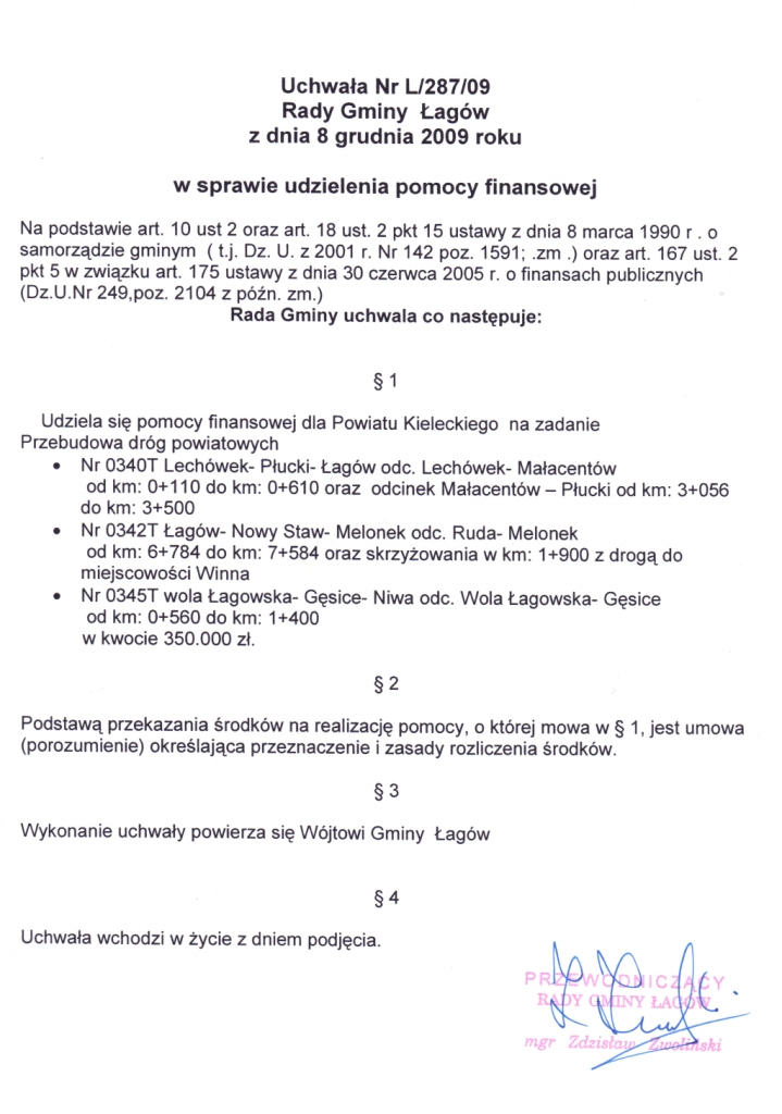 | Uchwała Nr L/287/09 Rady Gminy Łagów z dnia 08 grudnia 2009r. w sprawie udzielenia pomocy finansowej. | 2009-12-22 |