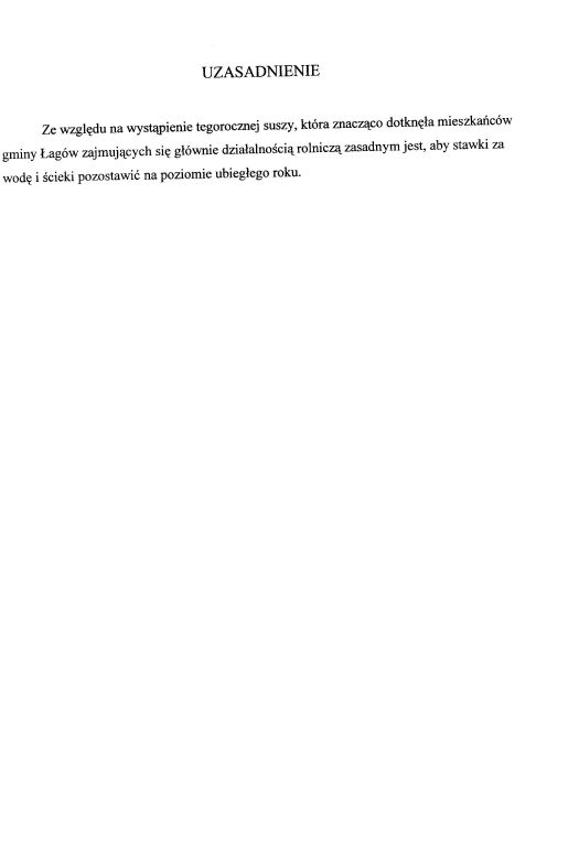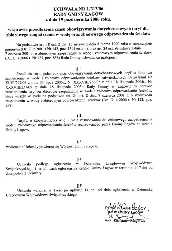 | Uchwała nr L/313/06 Rady Gminy w Łagowie z dn. 19 października 2006 r. w sprawie przedłużenia czasu obowiązywania dotychczasowych taryf dla zbiorowego zaopatrzenia w wodę orzaz zbiorowego odprowadzania ścieków. | 2008-10-02 |
