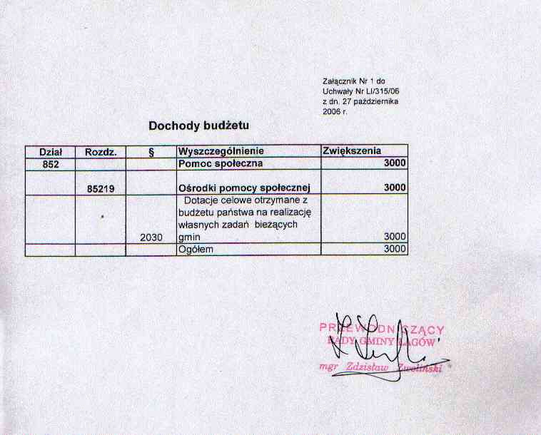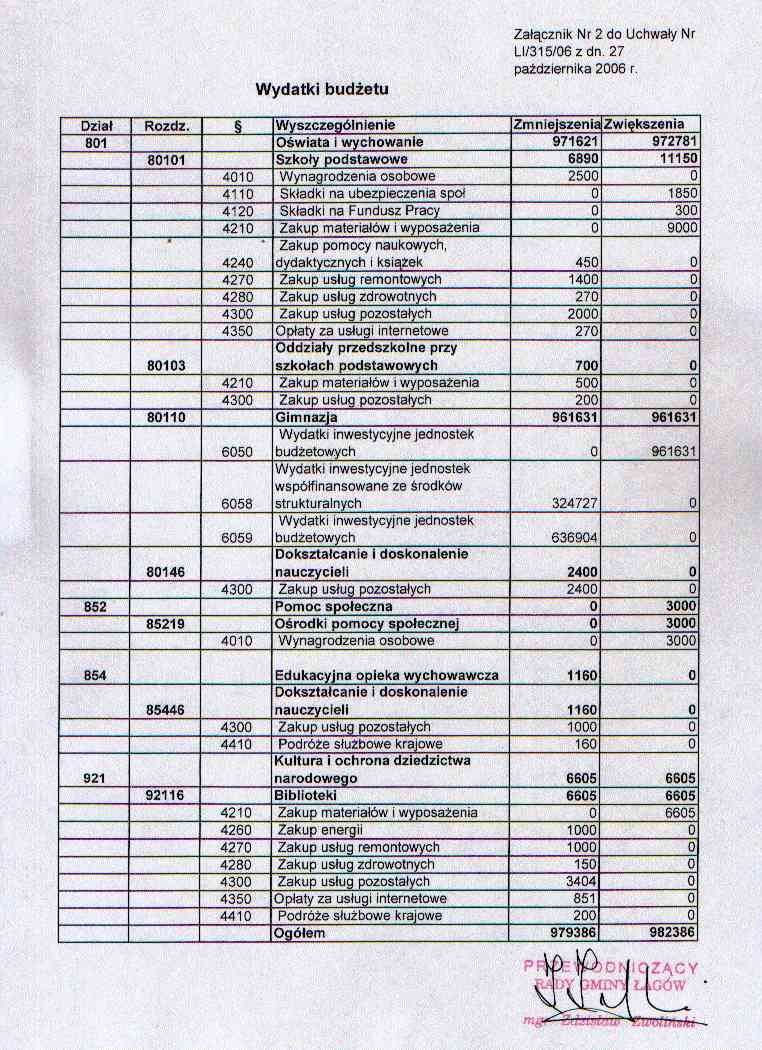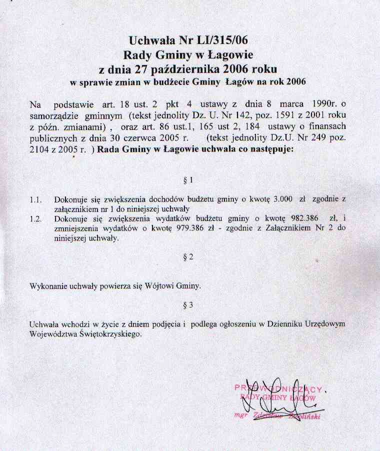 | Uchwała nr LI/315/06 rady Gminy w Łagowie z dn. 27 października 2006 r. w sprawie zmian w budżecie Gminy Łagów na rok 2006. | 2008-10-07 |