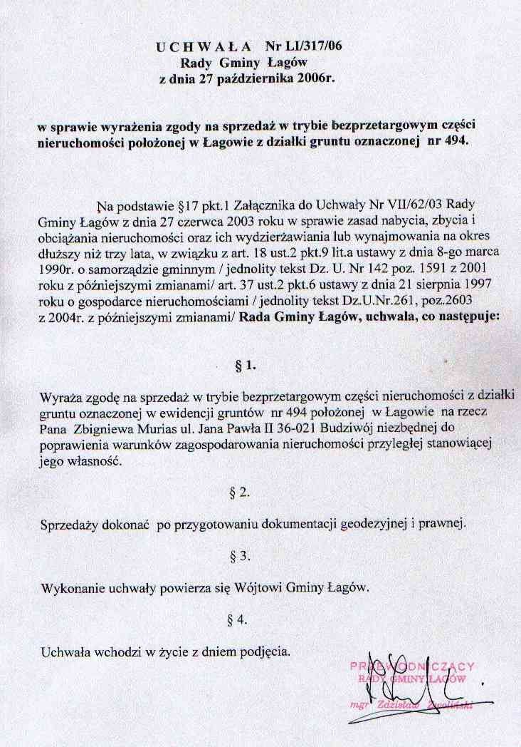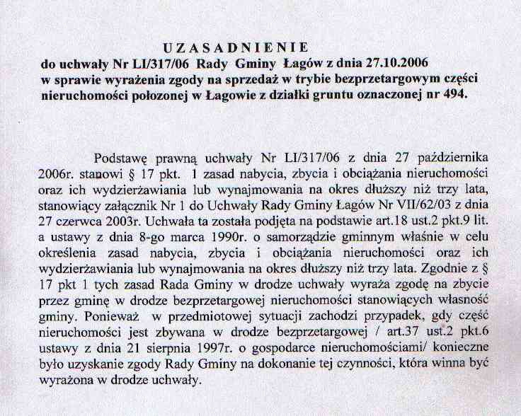 | Uchwała nr LI/317/06 Rady Gminy w Łagowie z dn. 27 października 2006 r. w sprawie wyrażenia zgody na sprzedaż w trybie bezprzetargowym części nieruchomości położonej w Łagowie z działki gruntu oznaczonej nr 494. | 2008-10-07 |