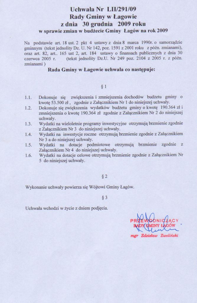 | Uchwała nr LII/291/09 Rady Gminy Łagów z dnia 30 grudnia 2009 r. w sprawie zmian w budżecie gminy Łagów na rok 2009 | 2010-01-07 |