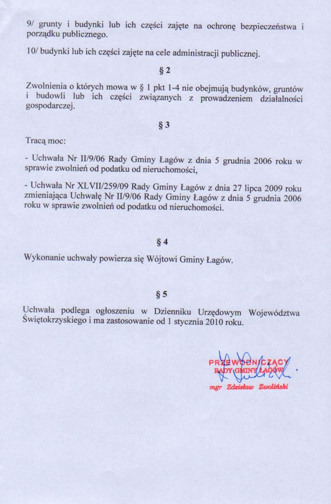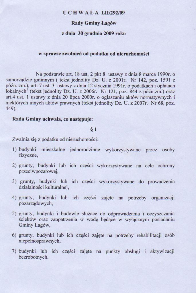 | Uchwała nr LII/292/09 Rady gminy Łagów z dnia 30 grudnia 2009 roku w sprawie zwolnieĂą od podatku od nieruchomości | 2010-01-07 |