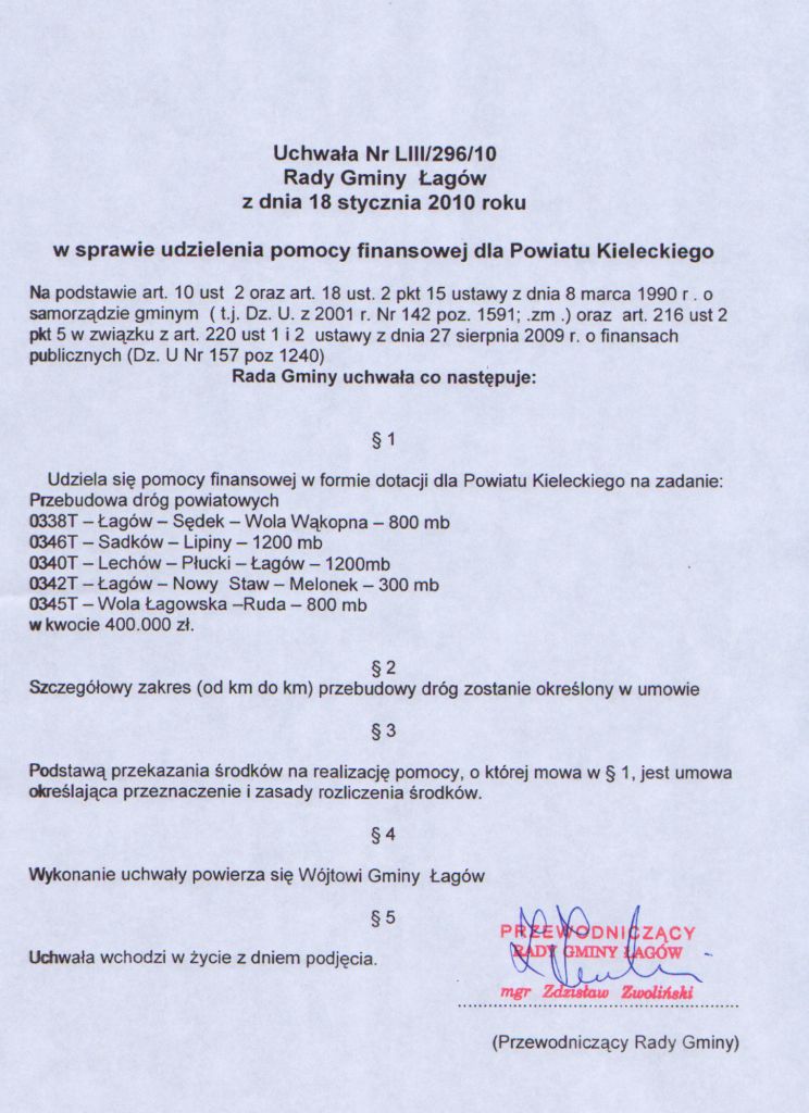 | Uchwała nr LIII/296/2010 Rady Gminy Łagów z dnia 18 stycznia w sprawie udzielenia pomocy finansowej dla Powiatu Kieleckiego | 2010-01-29 |