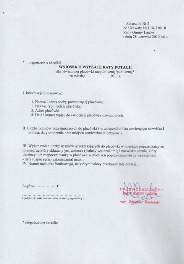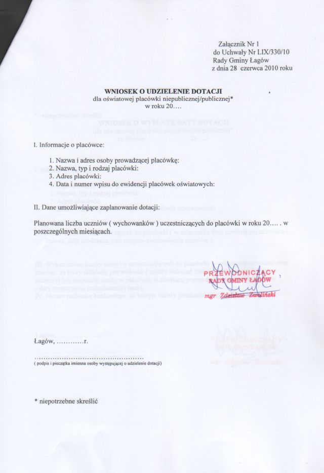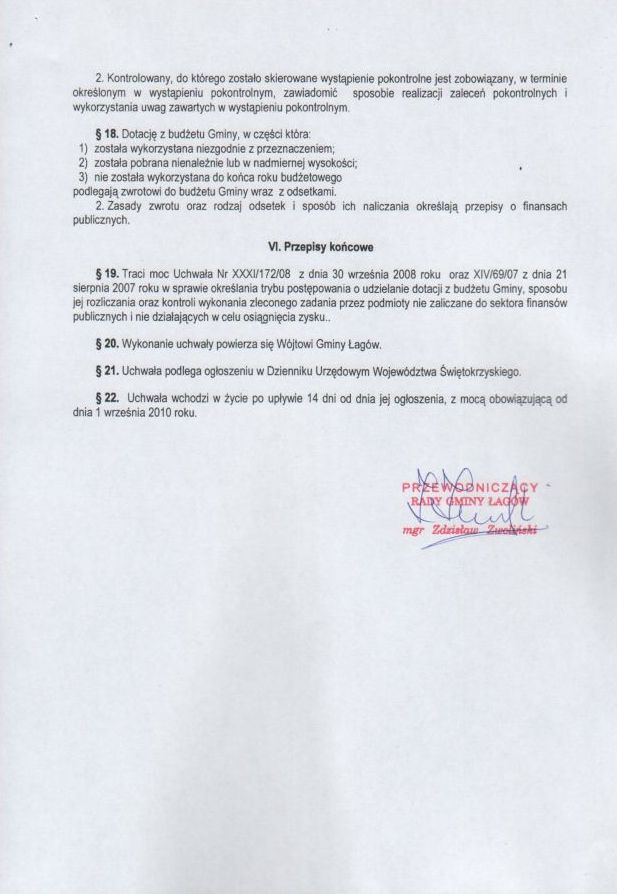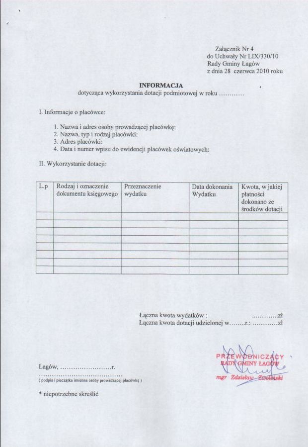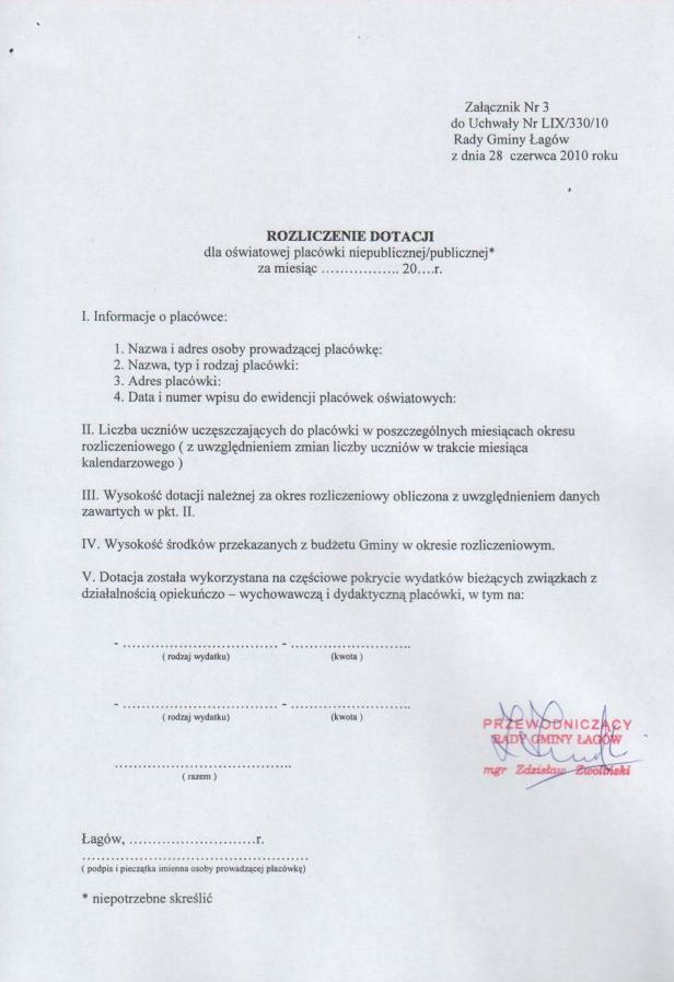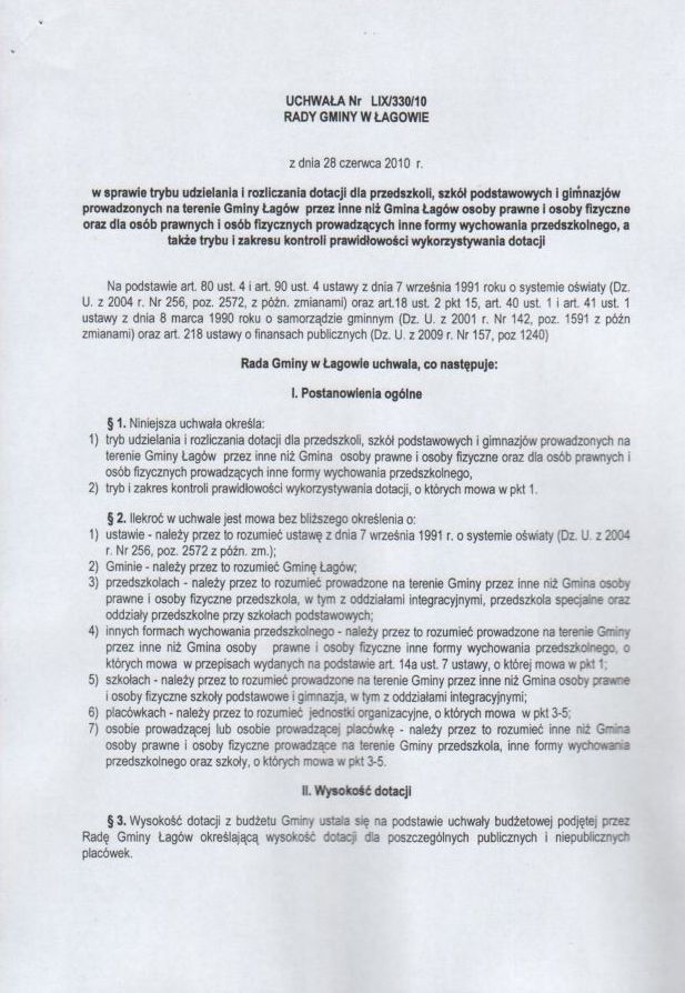 | Uchwała Nr LIX/330/10 Rady Gminy w Łagowie z dnia 28 czerwca 2010 r. w sprawie trybu udzielania i rozliczania dotacji dla przedszkoli, szkół podstawowych i gimanzjum na terenie Gminy Łagów | 2010-07-13 |