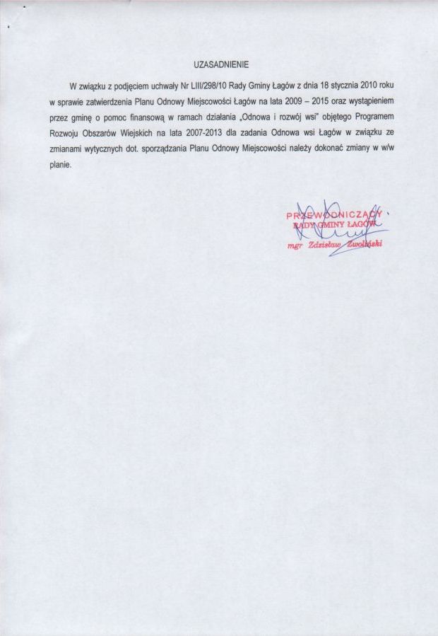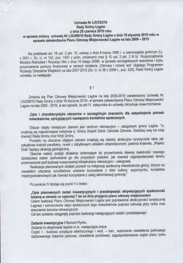 | Uchwała Nr LIX/333/10 Rady Gminy Łagów z dnia 28 czerwca 2010 r. w sprawie zminy uchwały Nr LIII/298/10 Rady Gminy Łagów z dnia 18 stycznia 2010 r. w sprawie zatwierdzenia Palnu Odnowy Miejscowości Łagów na lata 2009-2015 | 2010-07-14 |