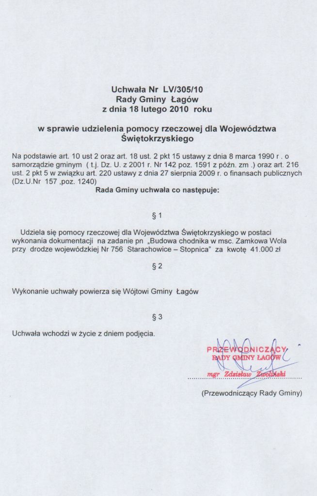 | Uchwała nr LV/305/10 Rady Gminy Łagów z dnia 18 lutego 2010 r. w sprawie udzielenia pomocy rzeczowej dla Województwa Świętokrzyskiego | 2010-03-04 |