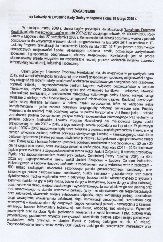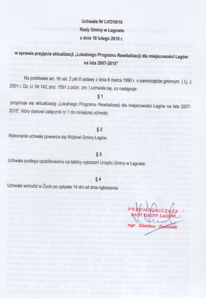 | Uchwała nr LV/310/2010 Rady Gminy Łagów z dnia 18 lutego 2010 r. w sprawie przyjęcia aktualizacji "Lokalnego Programu Rewiatalizacji dla miejscowości Łagów na lata 2007 - 2015" | 2010-03-05 |