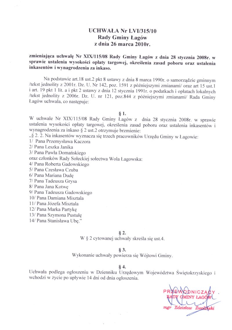 | Uchwała nr LVI/315/10 Rady Gminy Łagów z dnia 26 marca 2010 r. zmieniająca uchwałę nr XIX/115/08 Rady Gminy Łagów z dnia 28 stycznia 2008 r. | 2010-04-08 |