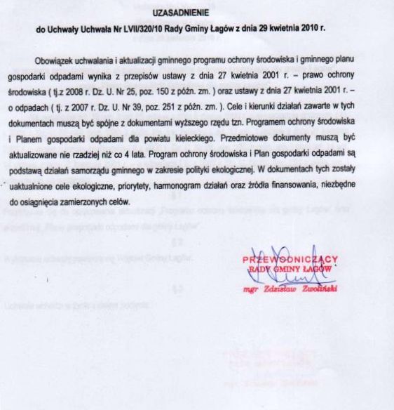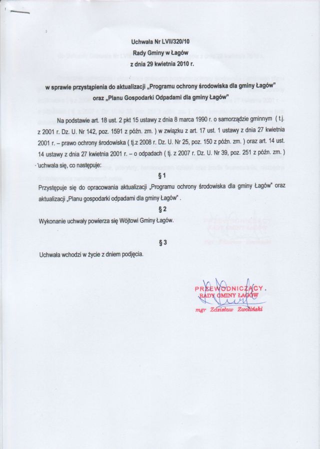 | Uchwała Nr LVII/320/10 Rada Gminy Łagów z dnia 29 kwietnia 2010 roku w sprawie przystąpienia do aktualizacji ,,Programu ochrony środowiska dla gminy Łagów" oraz ,,Planu Gospodarki Odpadami dla gminy Łagów" | 2010-05-14 |