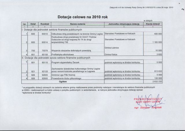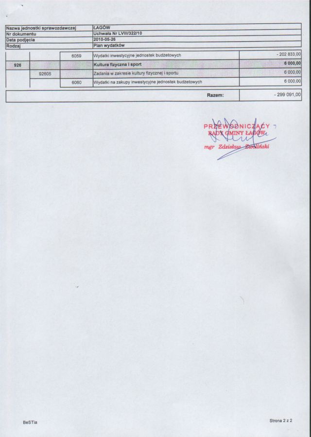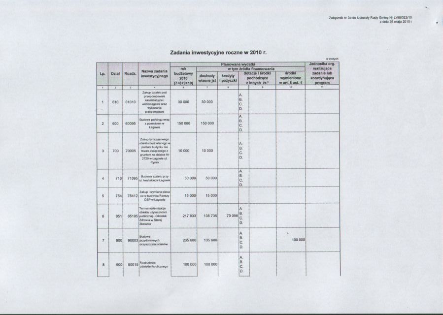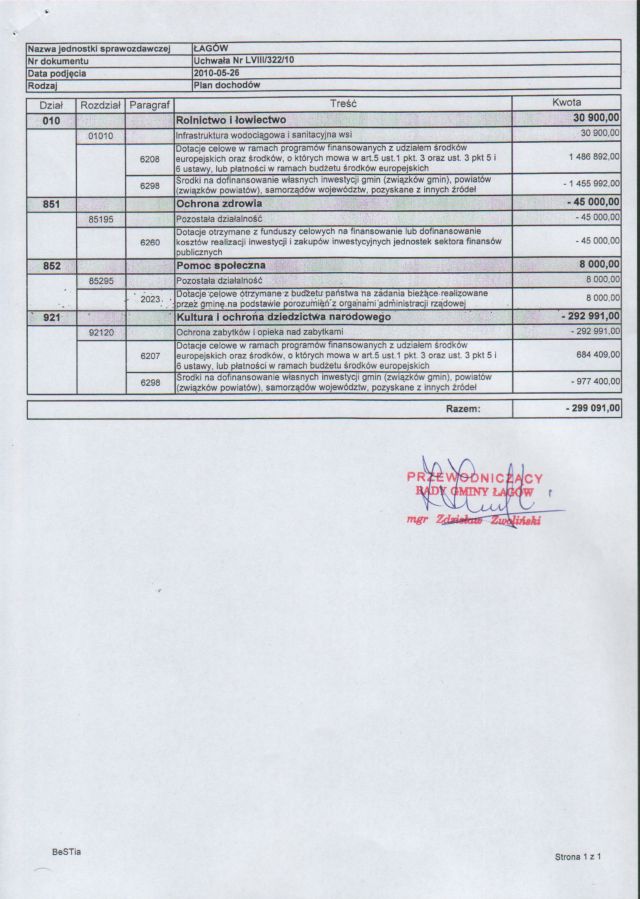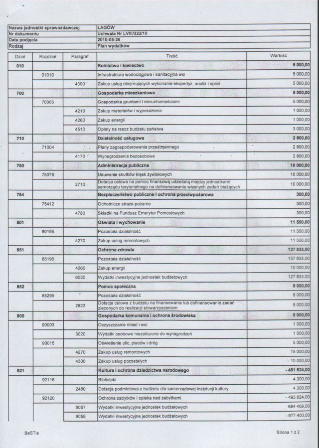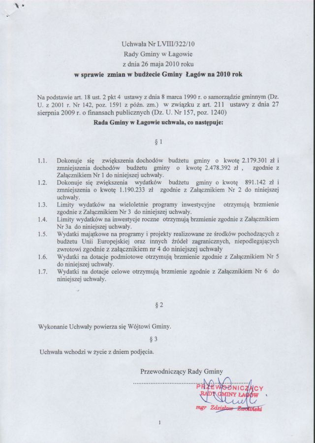 | Uchwała Nr LVIII/322/10 Rady Gminy w Łagowie z dnia 26 maja 2010 roku w sprawie zmian w budżecie Gminy Łagów na 2010 rok | 2010-06-18 |