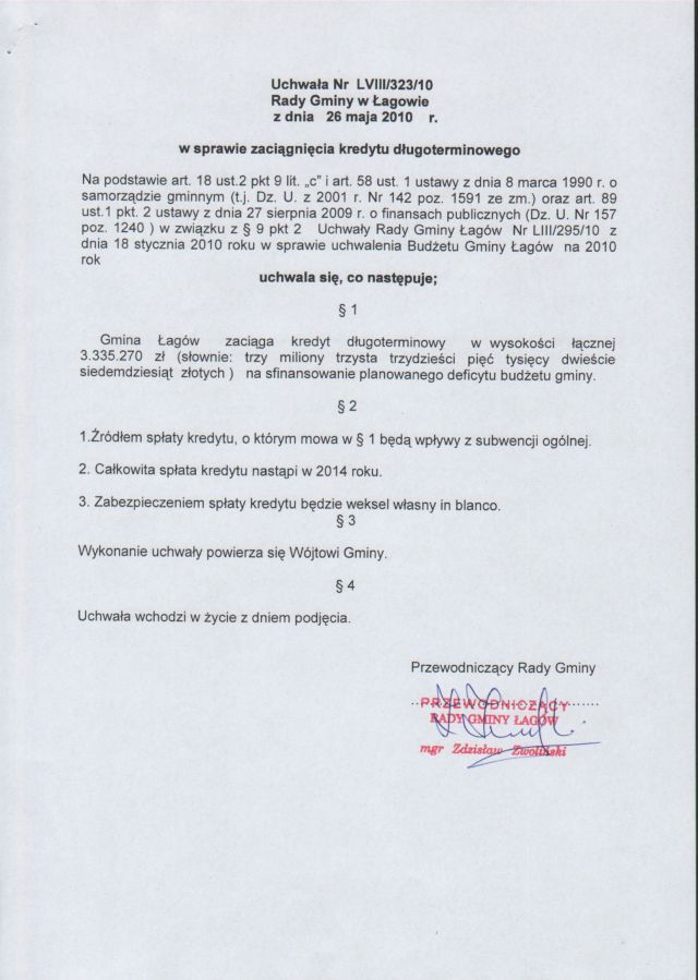 | Uchwała Nr LVIII/323/10 Rady Gminy w Łagowie z dnia 26 maja 2010 r. w sprawie zaciągnięcia kredytu długoterminowego | 2010-06-18 |