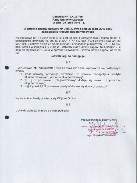 | Uchwała Nr LX/337/10 Rady Gminy w Łagowie z dnia 28 lipca 2010 r. w sprawie zmiany uchwały Nr LVIII/323/10 z dnia 26 maja 2010 roku zaciągnięcia kredytu długoterminowego | 2010-08-27 |