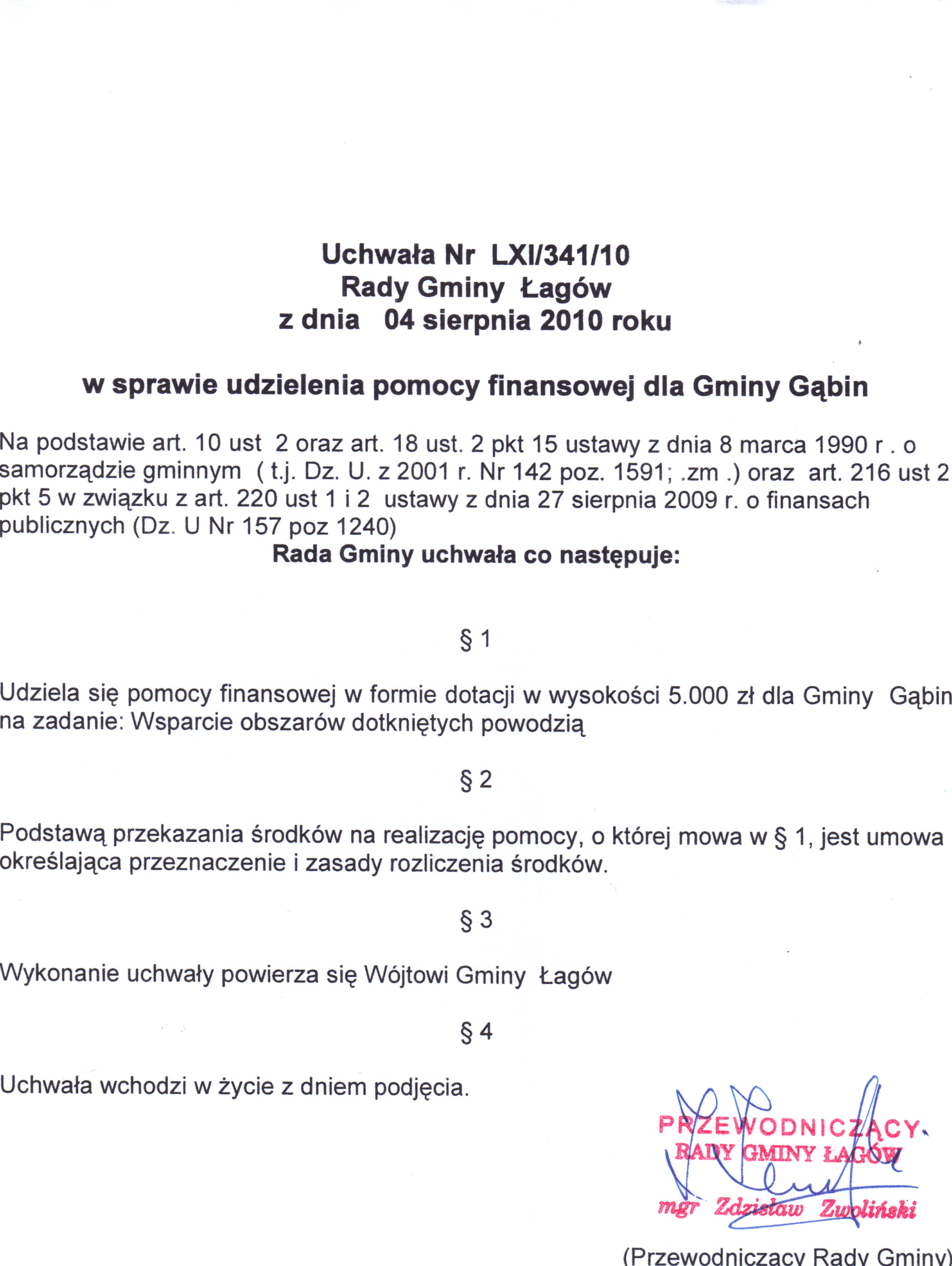 | Uchwała Nr LXI/341/10 Rady Gminy Łagów z dnia 04 sierpnia 2010 roku w sprawie udzielenia pomocy finansowej dl Gminy Gąbin | 2010-08-27 |
