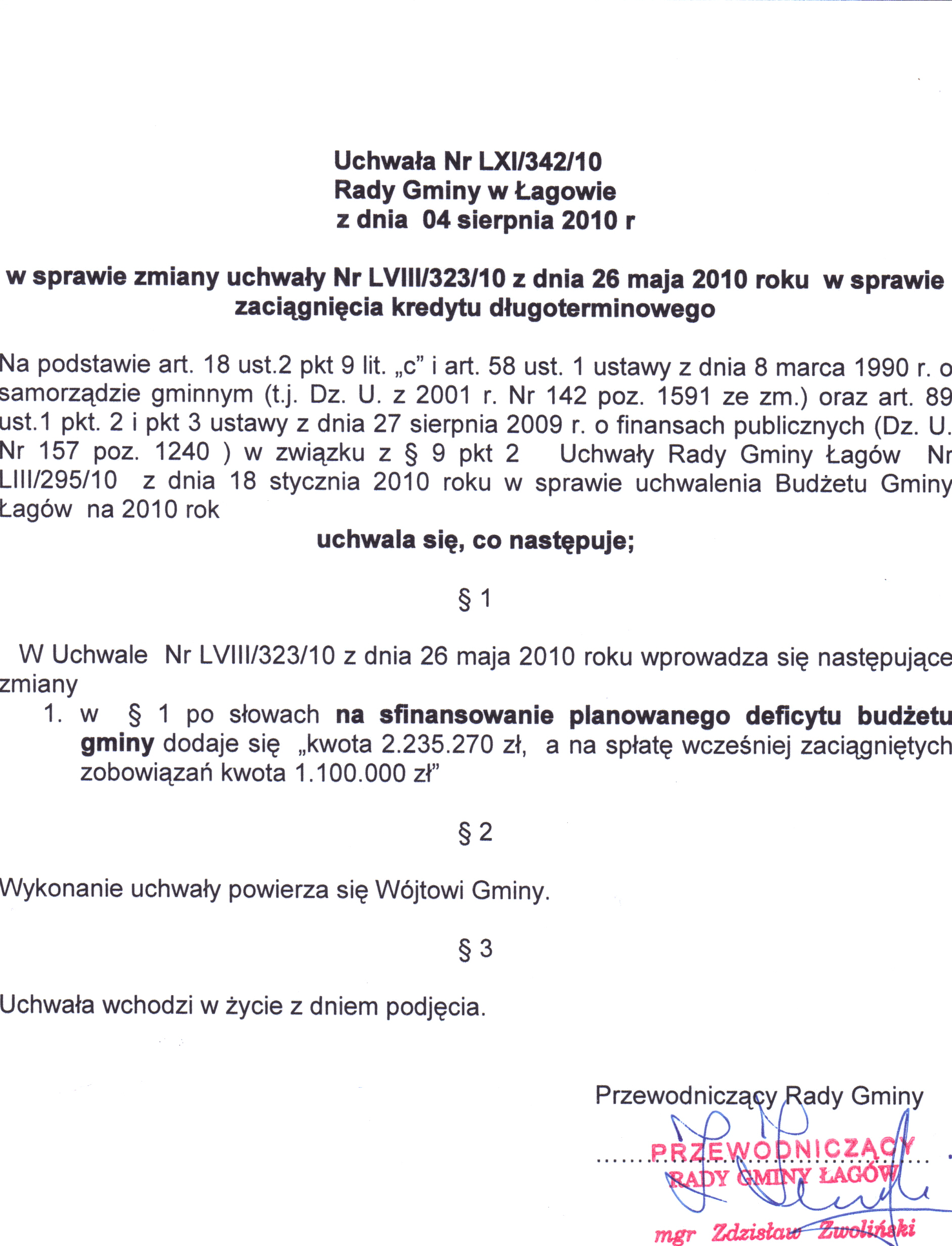 | Uchwała Nr LXI/342/10 rady Gminy w Łagowie z dnia 04 sierpnia 2010 r. w sprawie zmiany Uchwały Nr LVIII/323/10 z dnia 26 maja 2010 roku w sprawie zaciągnięcia kredytu długoterminowego | 2010-08-27 |