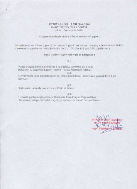 | Uchwała Nr LXII/346/2010 Rady Gminy w Łagowie z dnia 26 sierpnia 2010 r. w sprawie nadania nazwy ulicy w sołectwie Łagów | 2010-09-08 |