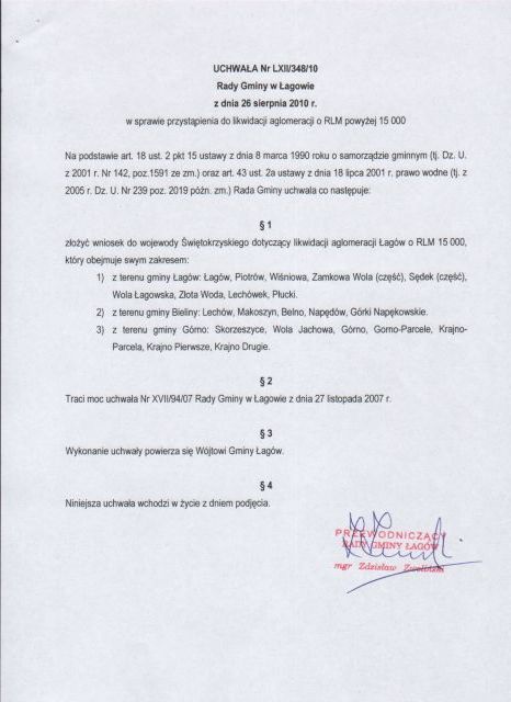 | Uchwała Nr LXII/348/10 Rady Gminy w Łagowie z dnia 26 sierpnia 2010 r. w sprawie przystąpienia do likwidacji aglomeracji o RLM powyżej 15 000 | 2010-09-08 |