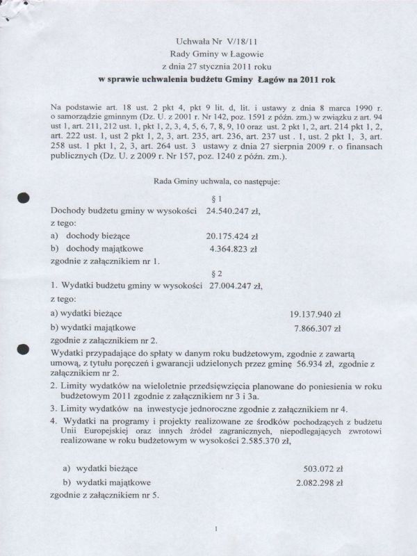 | Uchwała Nr V/18/11 Rady Gminy Łagów z dnia 27 stycznia 2011 roku w sprawie uchwalenia budżetu Gminy Łagów na 2011 rok | 2011-02-10 |