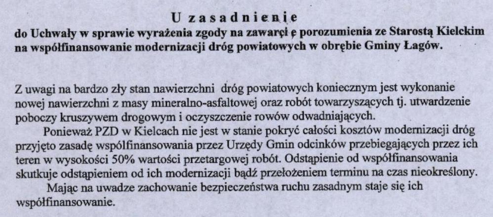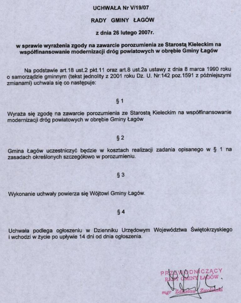 | Uchwała nr V/19/07 Rady gminy Łagów z dnia 26 lutego 2007 r. w sprawie wyrażenia zdody na zawarcie porozumienia ze Starosta Kieleckim na współfinansowanie modernizacji dróg powiatowych w obrębie Gminy Łagów | 2008-08-25 |
