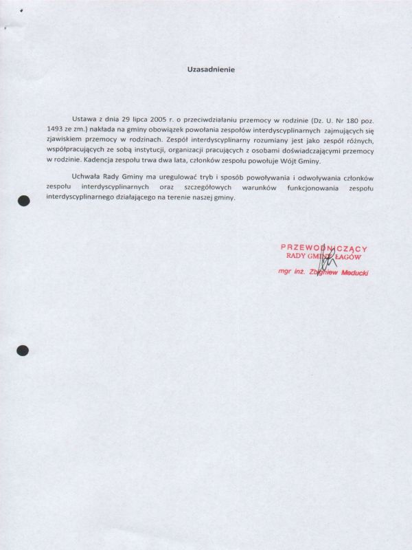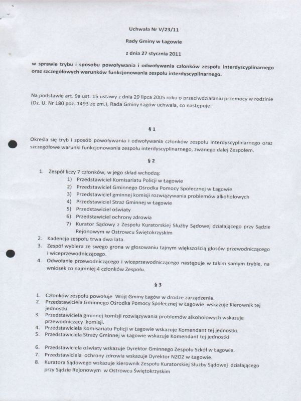 | Uchwała Nr V/23/11 Rady Gminy w Łagowie z dnia 27 stycznia 2011 w sprawie trybu i sposobu powoływania i odwoływania członków zespołu interdysyplinarnego oraz warunków funkcjonowania zespołu interdyscyplinarnego | 2011-02-10 |