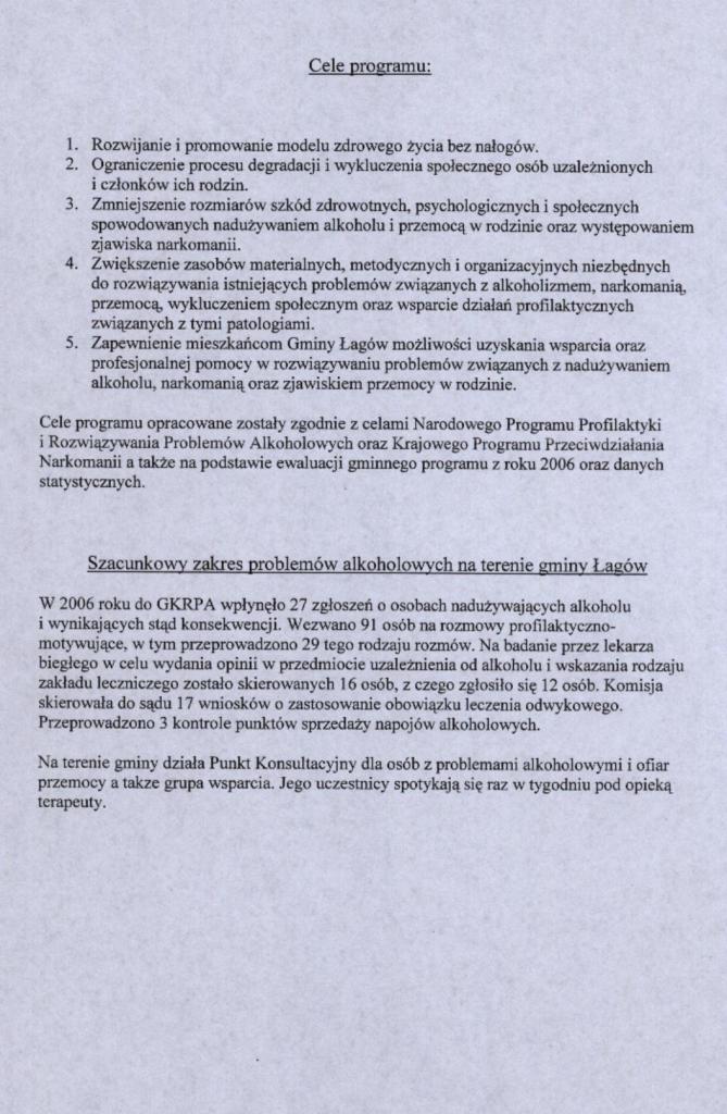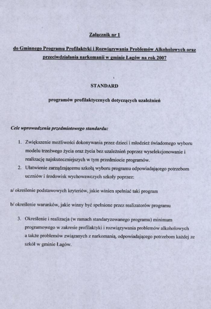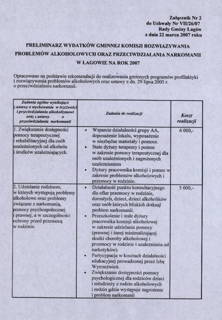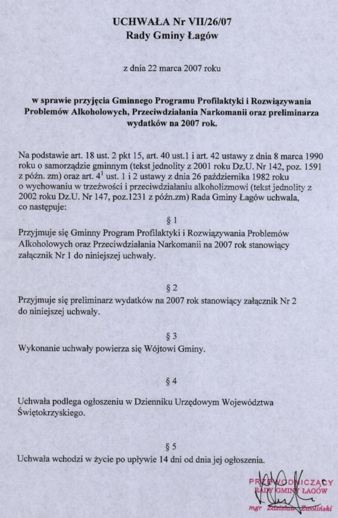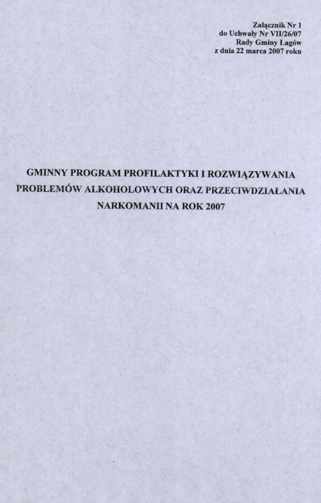 | Uchwała nr VII/26/07 Rady Gminy Łagów z dnia 22 marca 2007 r. w sprawie przyjecia Gminnego Programu Profilaktyki i Rozwiazywania Problemów Alkoholowych, Przeciwdziałanie Narkomanii oraz prelimianarza wydatków na 2007 r. | 2008-08-25 |
