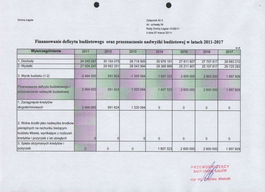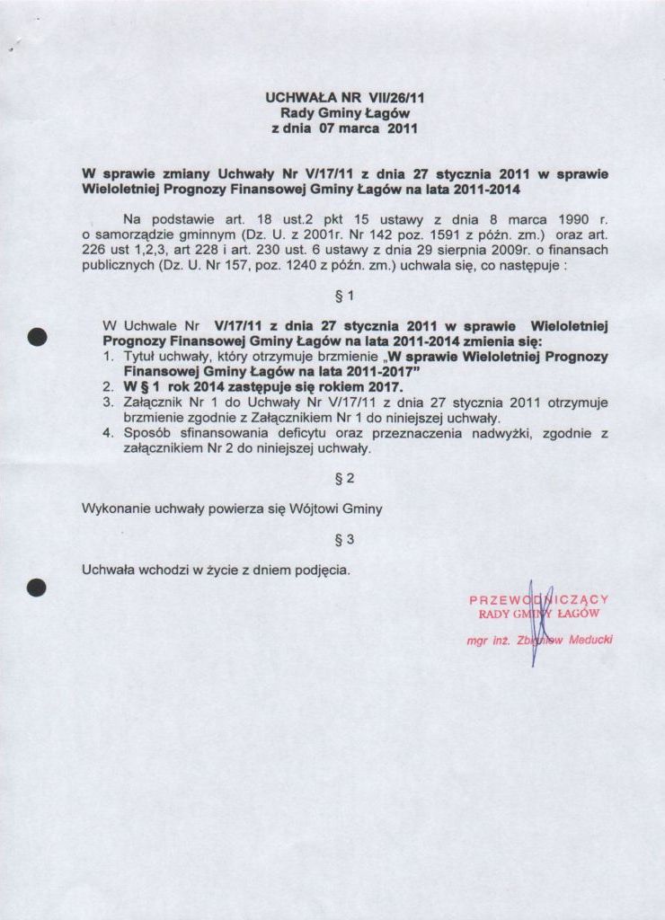 | Uchwała Nr VII/26/11 Rady Gminy Łagów z dnia 07 marca 2011 r. w sprawie zmiany Uchwały Nr V/17/11 z dnia 27 stycznia 2011 w sprawie Wieloletniej Prognozy Finansowej Gminy Łagów na lata 2011 - 2014 | 2011-03-16 |