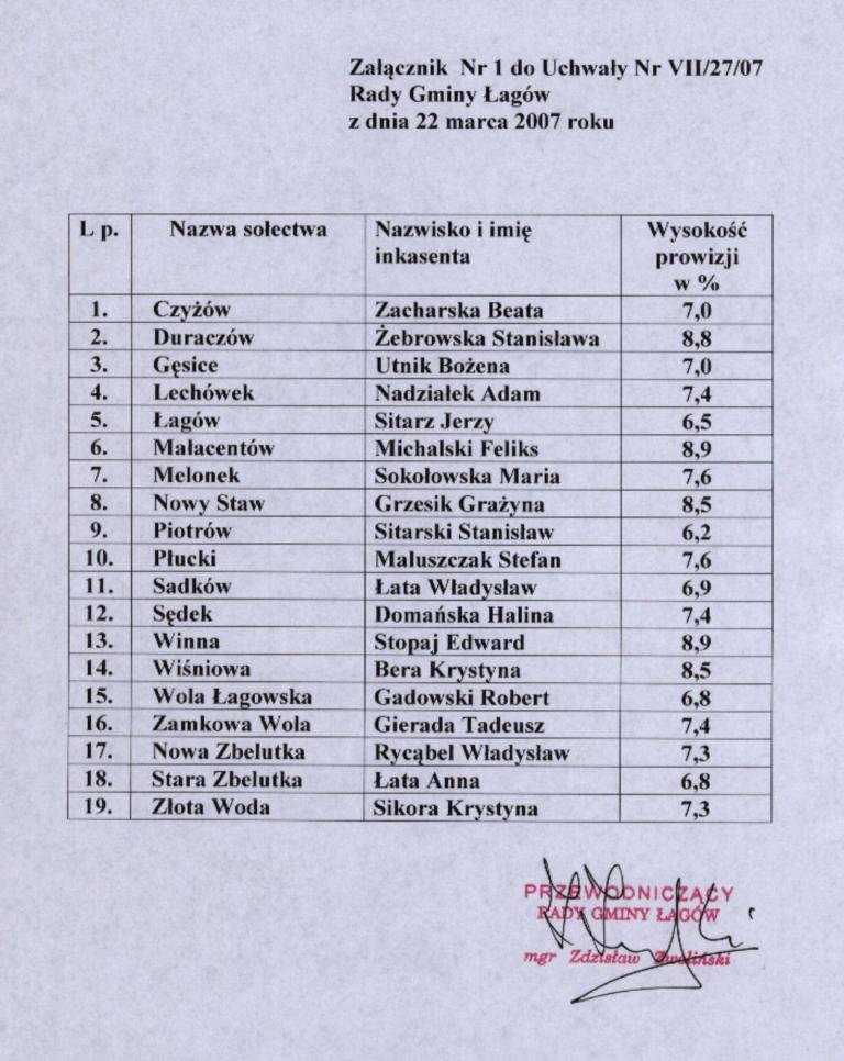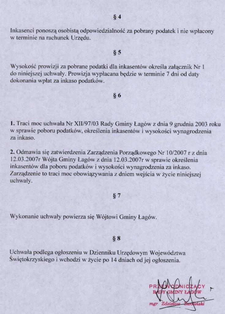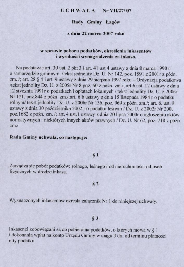 | Uchwała nr VII/27/07 Rady Gminy Łagów z dnia 22 marca 2007 r. w sprawie poboru podatków, określenia inkasentów i wysokości wynagrodzenia za inkso | 2008-08-25 |